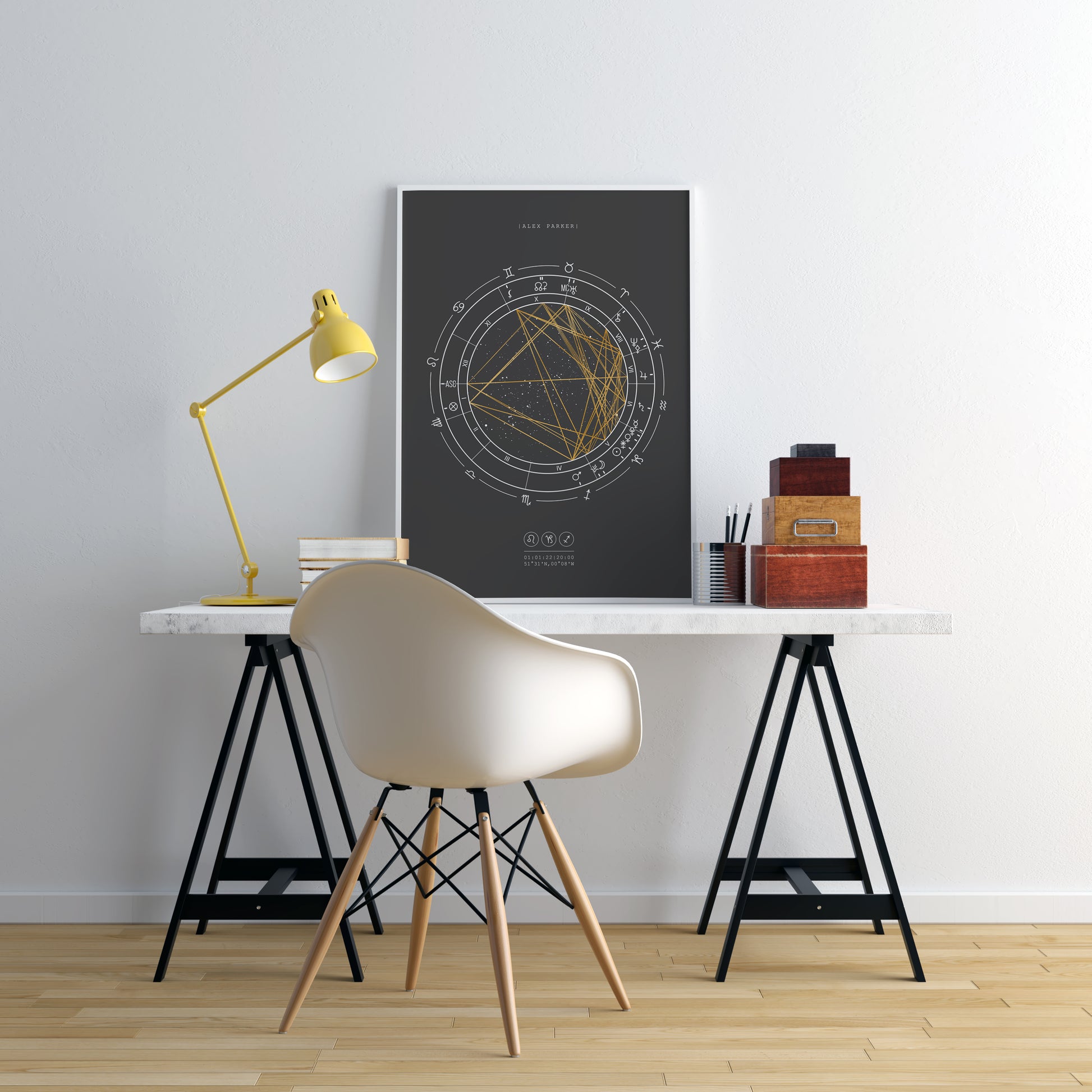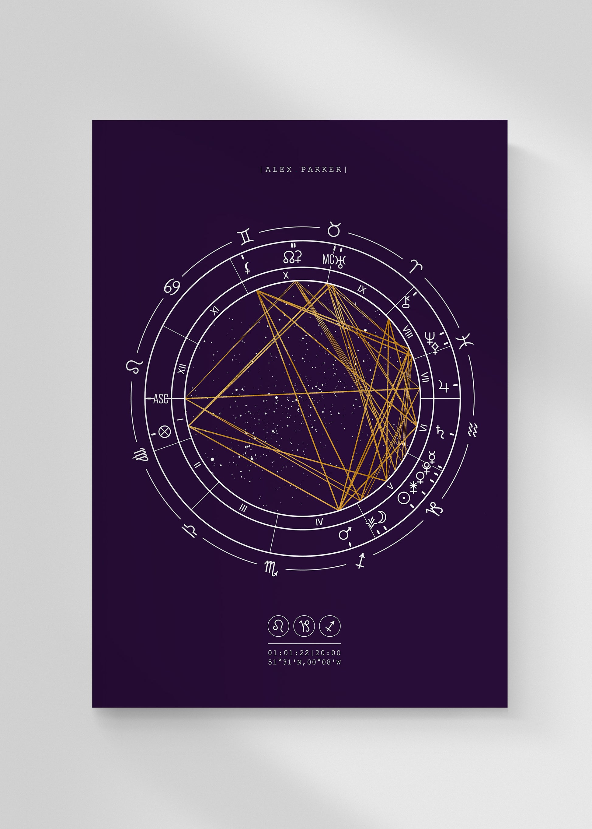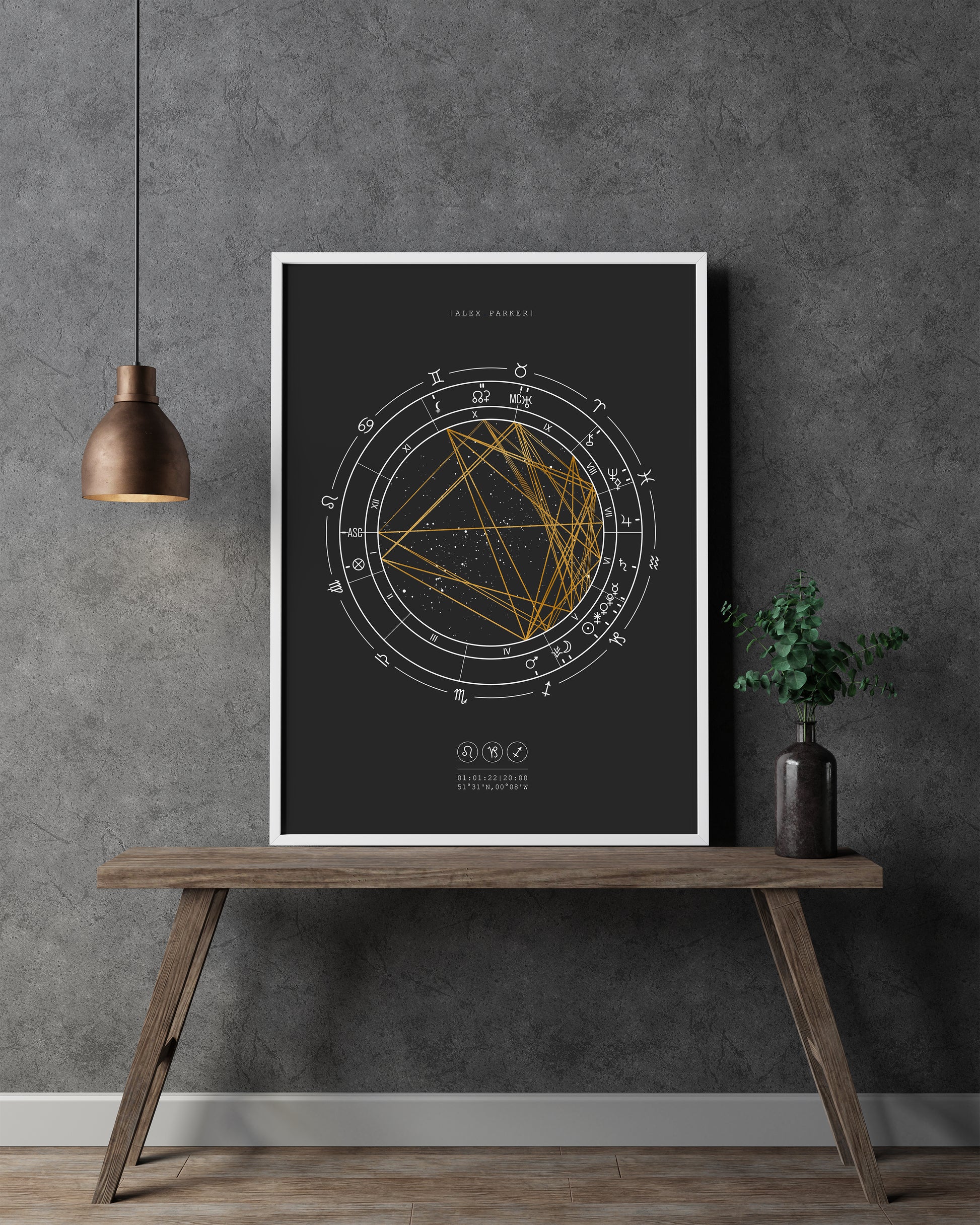 This quality print combines your unique birth chart with your personal star chart. The unique aspect lines on each birth chart have a special foil effect adding shine to the print and bold design. We use the Placidus house system but are more than happy to use other house systems upon your request.