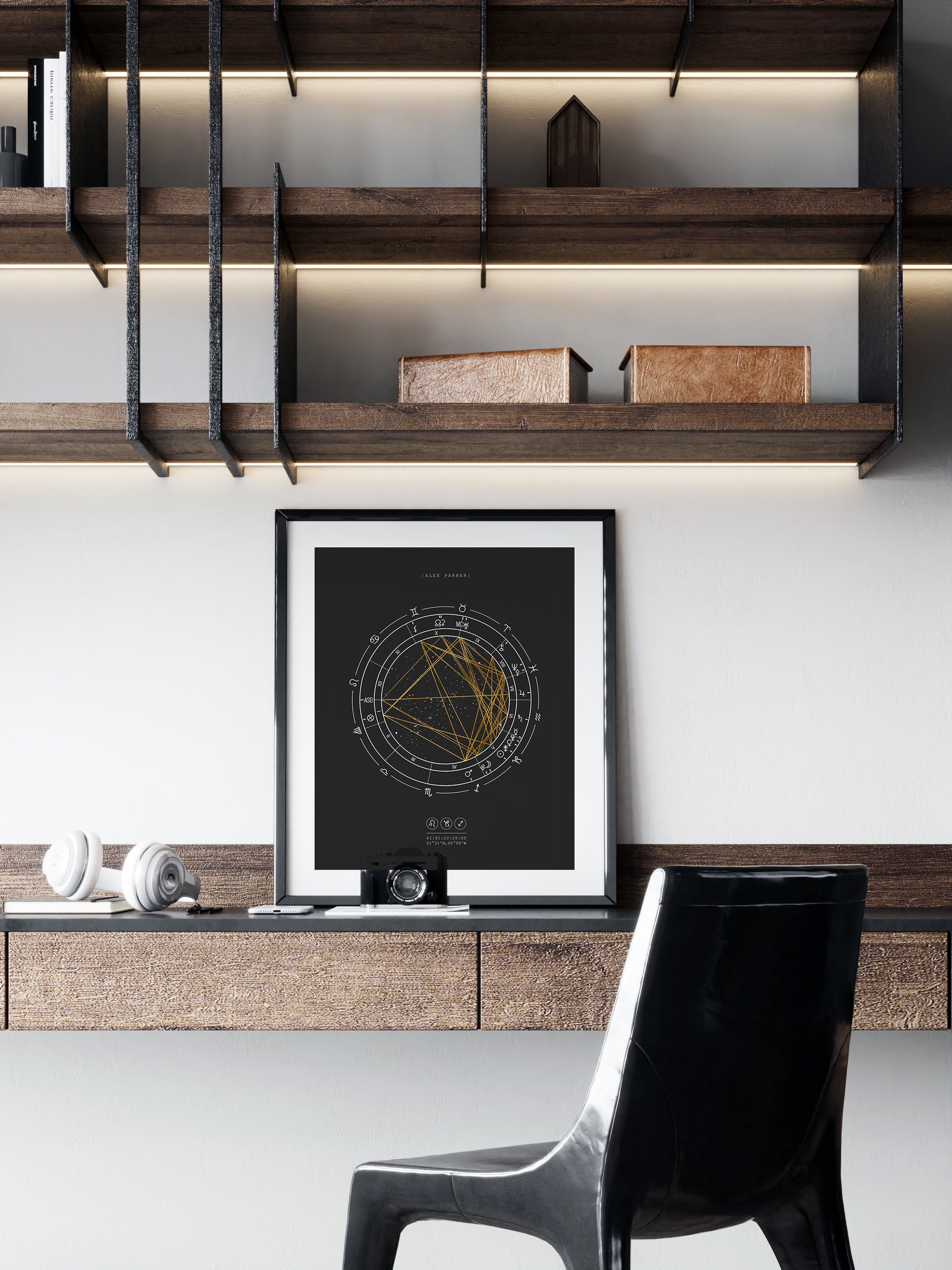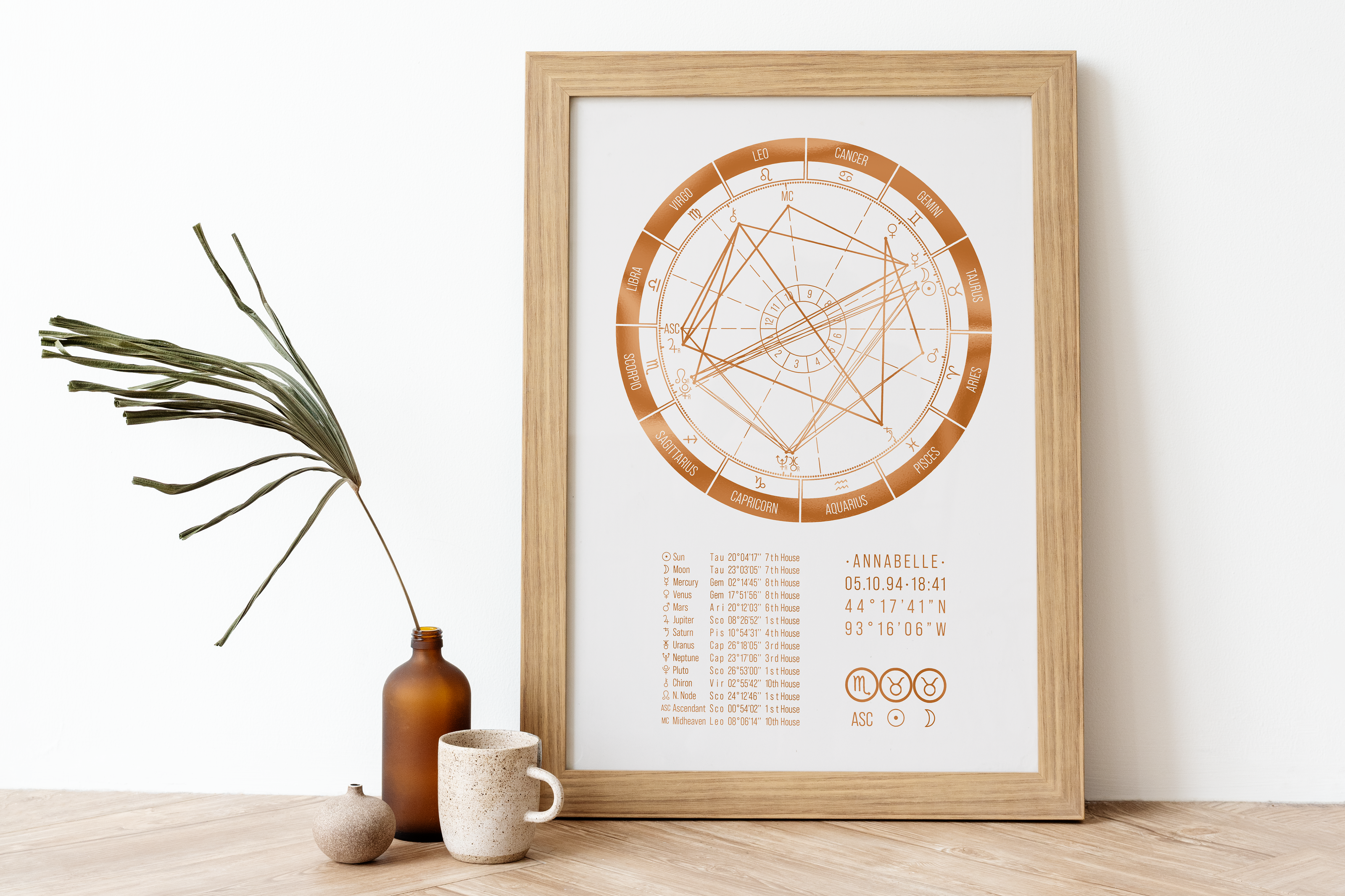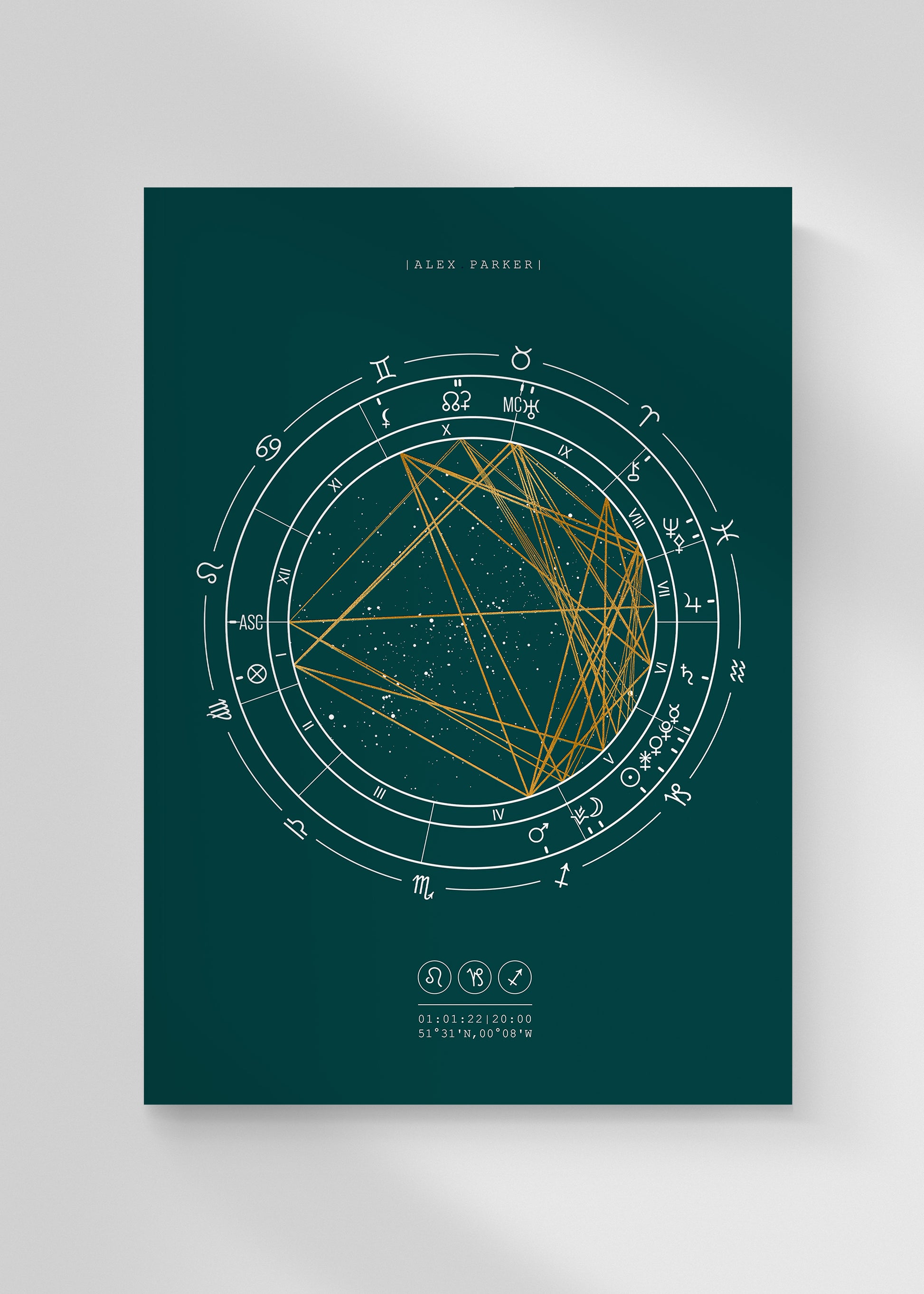 This quality print combines your unique birth chart with your personal star chart. The unique aspect lines on each birth chart have a special foil effect adding shine to the print and bold design. We use the Placidus house system but are more than happy to use other house systems upon your request.