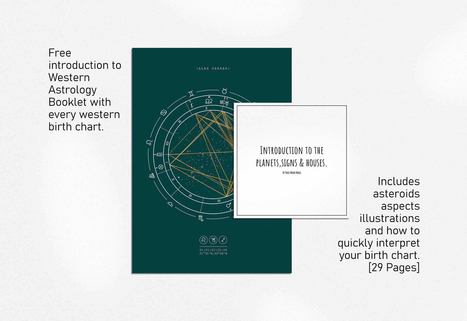 Every birth chart also comes with our very own free 29 page introduction booklet. It explains how to best read a birth chart and includes illustrations. It is a special guide and a great source for anyone who wants to start understanding their birth chart or who is learning astrology.