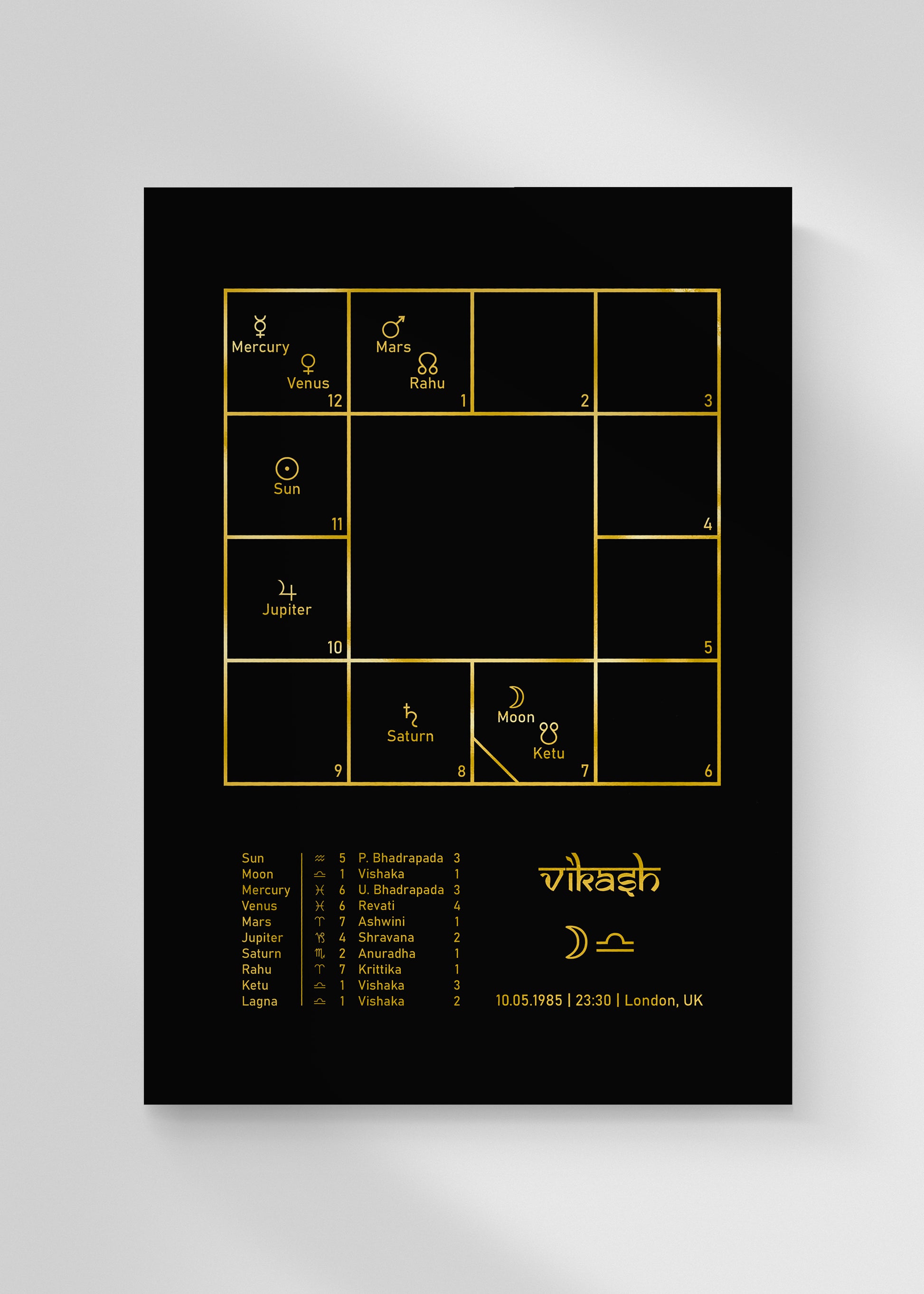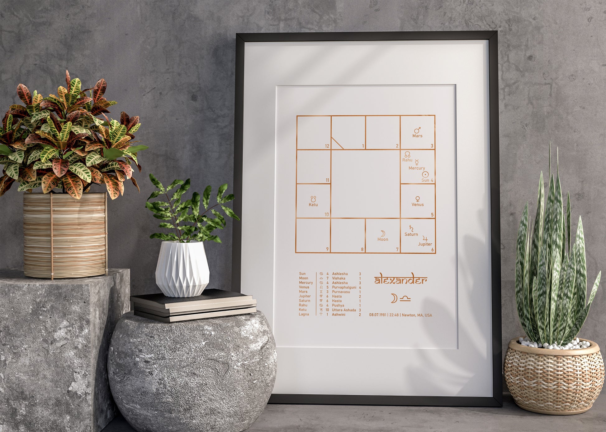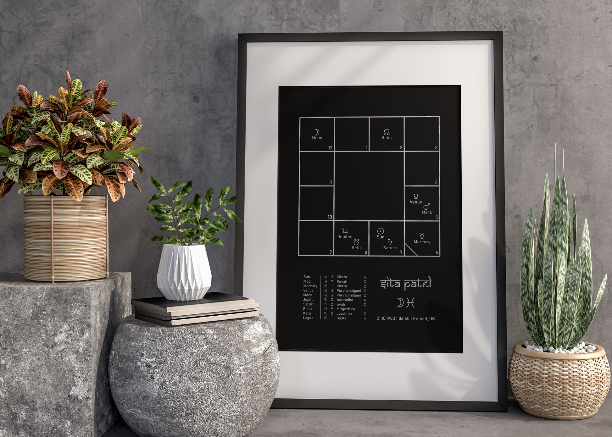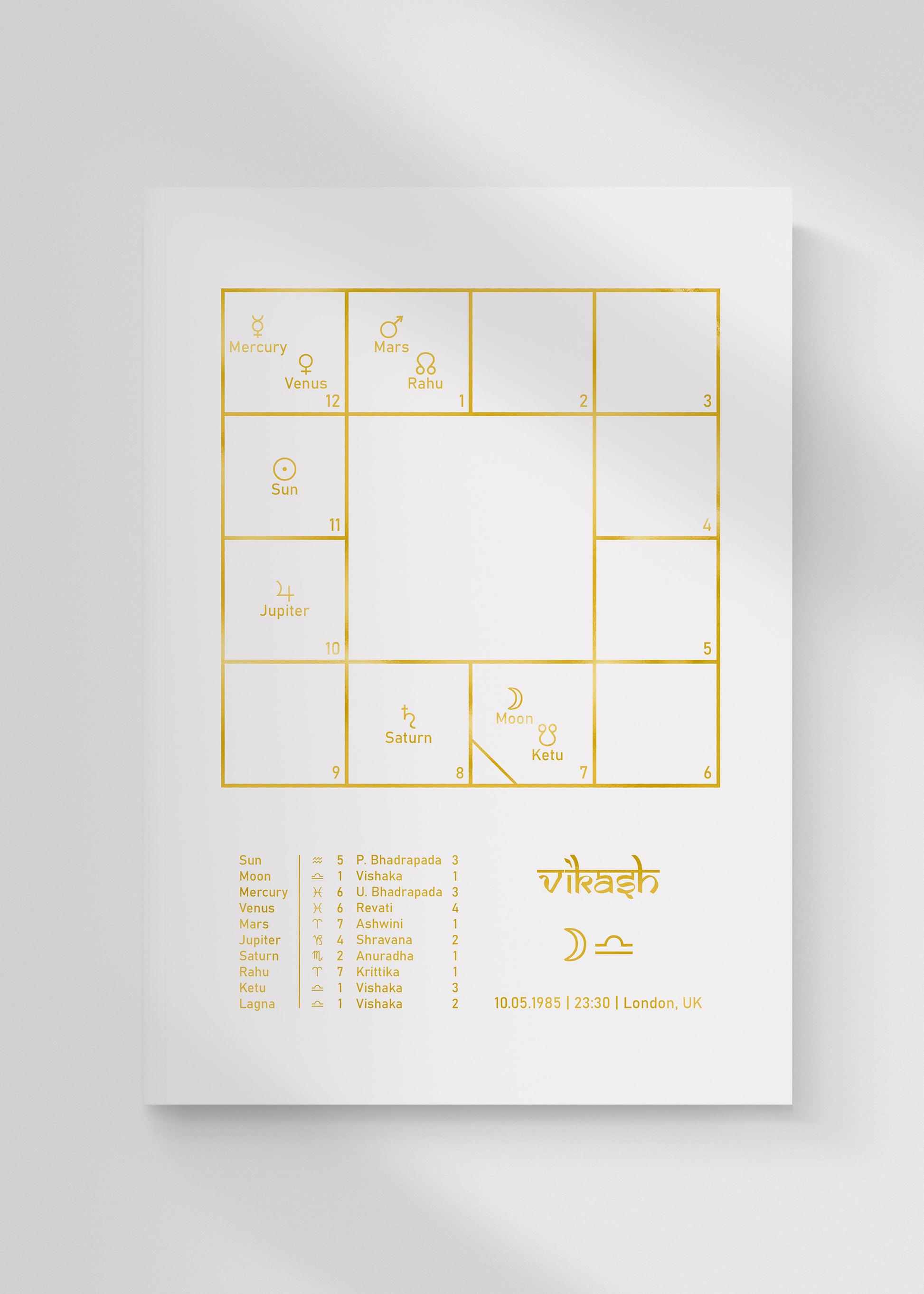 Vedic Astrology is the ancient and oldest form of astrology still used today. This is a personalised South Indian, Vedic Birth Chart foil print, which shows your Planets, Signs and Houses along with your Nakshatra and Pada placements. A great gift for anyone studying or interested in Vedic astrology.