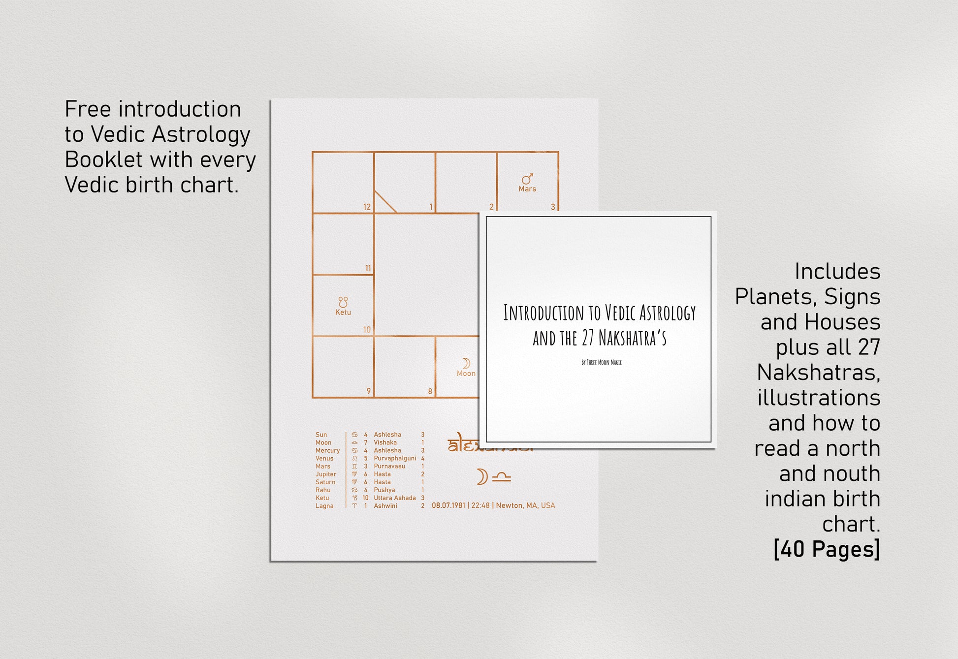 Every Vedic birth chart comes with our very own free 42-page introduction booklet. It is a special guide and a great source for anyone who wants to start understanding their birth chart or who is learning astrology. It explains how to best read a Vedic birth chart and introduces you to the Vedic representations of the Planets, Signs and Houses. In it, we also introduce you to the 27 Nakshatras (the 2nd Zodiac of Vedic astrology)